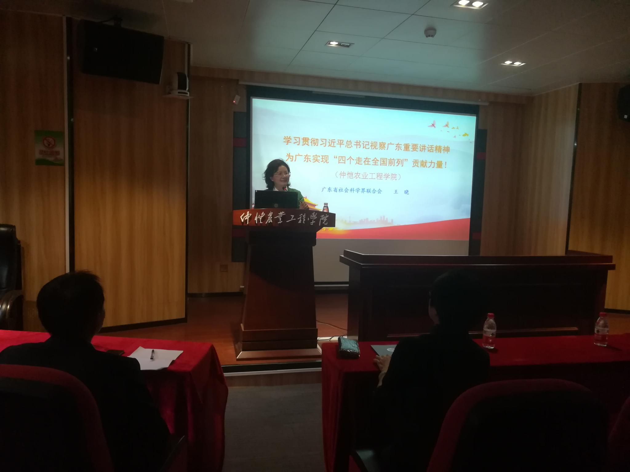 李海燕副书记做总结讲话,要求全体马院教师、辅导员,要进加深对习近平总书记视察广东重要讲话精神的了解和认识,结合王主席报告会内容和学校实际,认真践行讲话精神,以更加奋发有为成绩迎建国七十周年的到来。