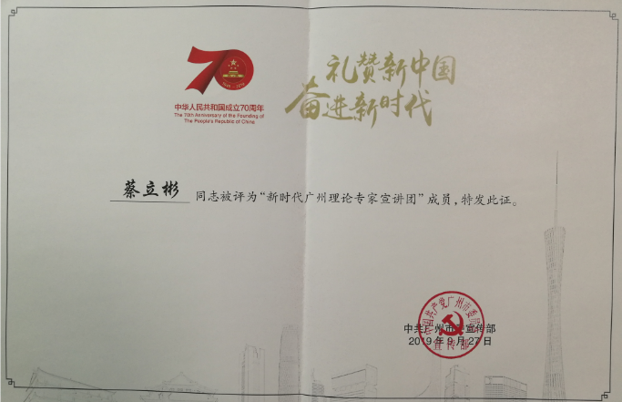 会上,广州市委常委、宣传部长徐咏虹同志为新时代广州理论专家宣讲团成员颁发荣誉证书。我校永利集团304蔡立彬、翁礼成两教授荣获此荣誉。