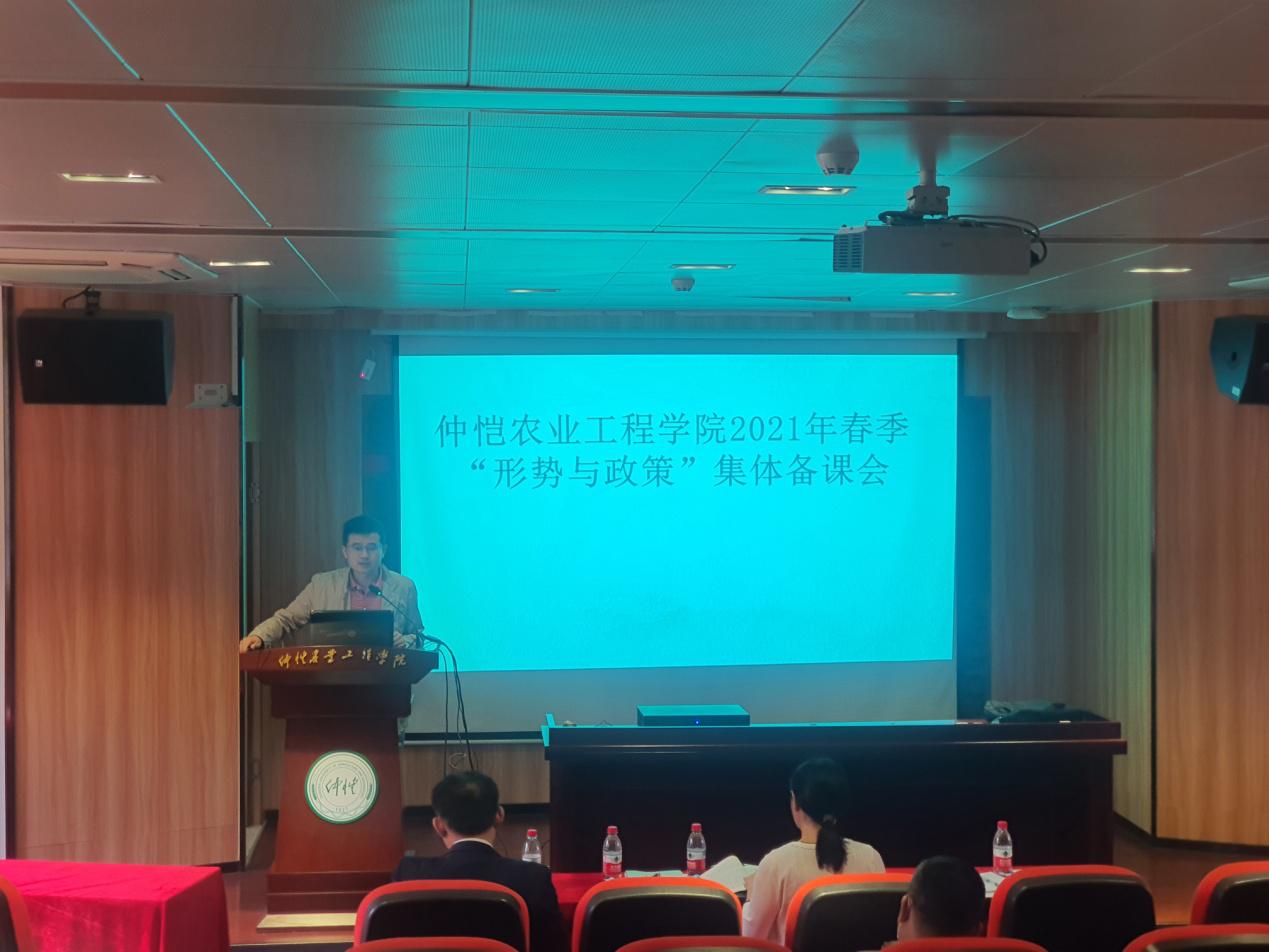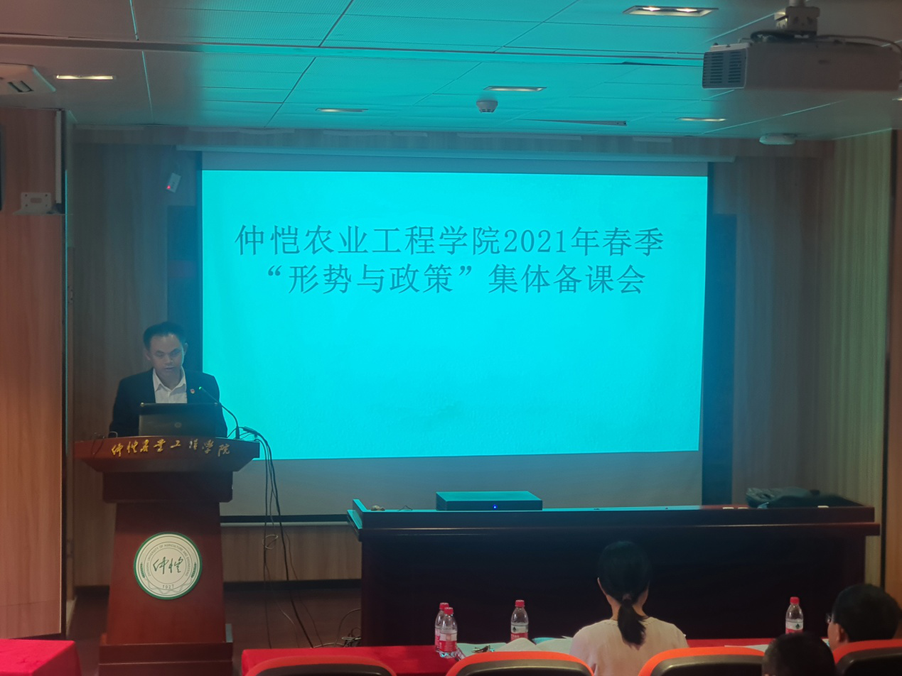 为深入学习贯彻习近平新时代中国特色社会主义思想和2021年全国“两会精神”,提升“形势与政策”课质量和水平,根据《广东省教育厅办公室关于2021春季“形势与政策”课备课会的通知》、《广东省教育厅关于做好2021春季学期高校党委书记、校长和院(系)党组织书记、院长(系主任)及中小学党组织书记、校长上第一堂思政课工作的通知》、《关于做好各学院党总支书记、院长上第一堂思想政治理论课工作的通知》(仲党办字[2021]8号)以及学校的相关制度,永利集团304于4月9日在英东楼111学术报告厅举办了2021春季学期全校“形势与政策”课集体备课会。会议由蔡立彬院长主持,秦抗抗副院长介绍本学期“形势与政策”课教学安排,形势与政策教研室施张兵、向丽和李晓燕等三位专任教师做示范教学。