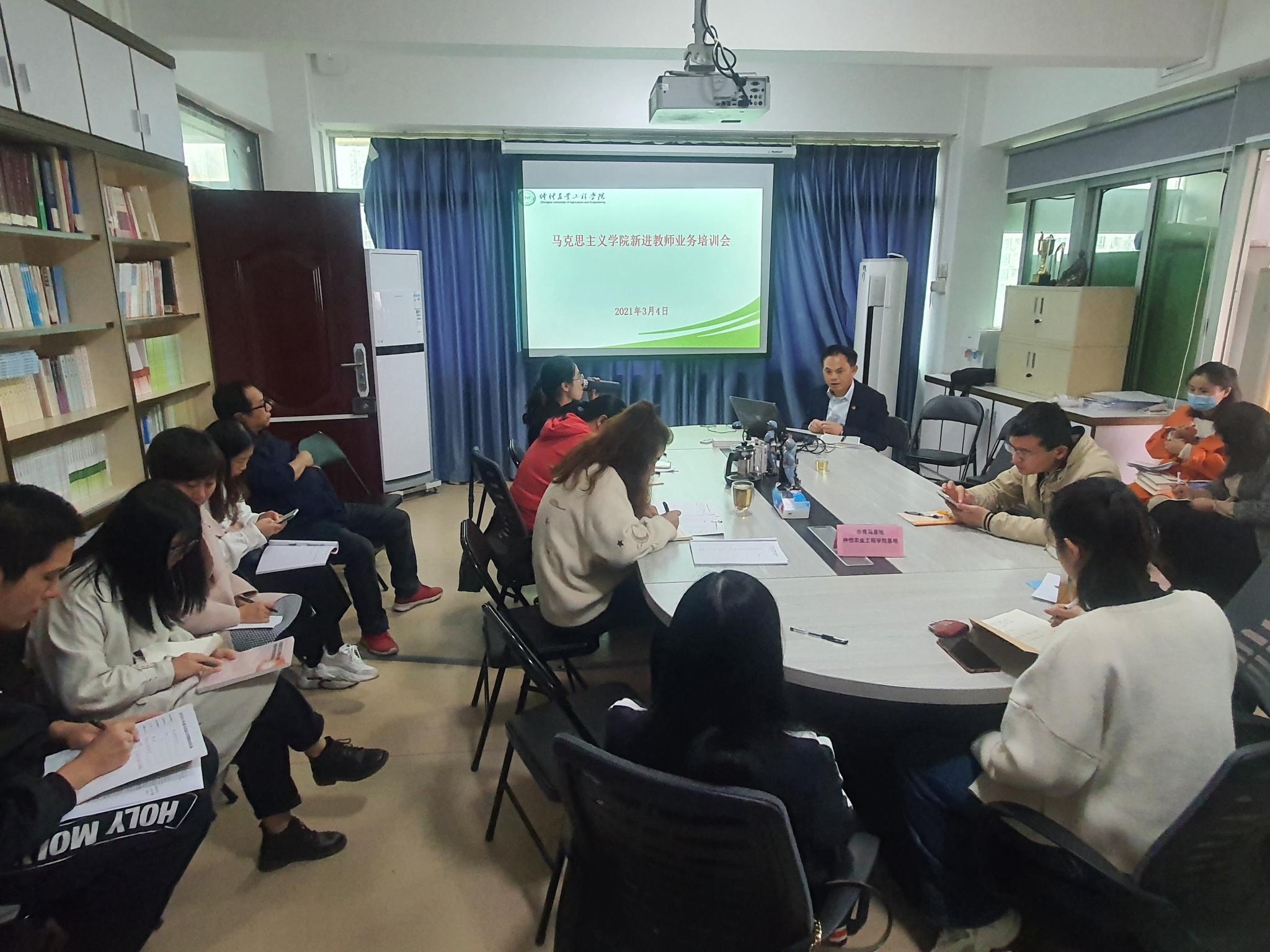 秦抗抗副院长在会议上作了《新时代思想政治理论课教学改革探索》的报告。首先建议各位新进教师结合学校“纪念性”、“注重实践”两大特色来开展自己的教学工作。其次告诫各位新进教师,要树立牢固教学工作的底线思维,随后介绍了学院在体验式教学改革方面取得的成果,鼓励新进教师开发既生动深刻又具有政治味的特色课程资源。