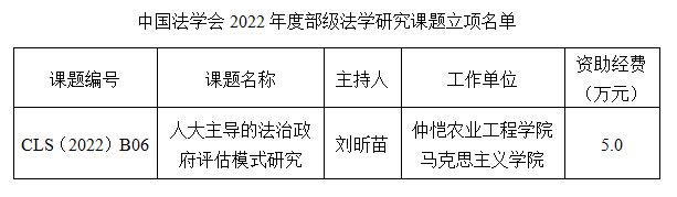 9月7日,中国法学会公布了《中国法学会2022年度部级法学研究课题立项名单》,我校永利集团304刘昕苗博士申报的“人大主导的法治政府评估模式研究”获立为中国法学会2022年度部级法学研究重点课题,资助经费5万元。
